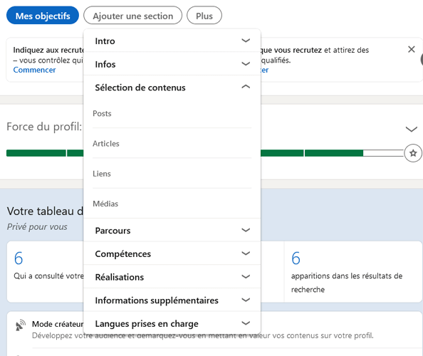 Pour mettre votre CV sur votre profil Linkedin, il y a 2 solutions. Créer un post ou ajouter un média à votre profil.